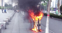 山東青島路邊垃圾桶著火司機齊心把火滅