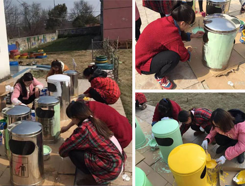 為了進一步提升校園文化,創建更加優美的育人環境,推動幼兒園建設朝著凈化、美化、規范化的方向發展,幼兒園青年教師對園內垃圾桶進行美化、裝飾。 教師們先選稿、討論設計方案,再畫底稿,最后調油漆上色。經過老師們的巧手布置,原本單調呆板的垃圾桶一個個鮮活起來。孩子們來園看到一個個五彩繽紛的垃圾桶興奮極了,非常樂意把垃圾撿起來扔進漂亮的垃圾桶里。 據悉,本次活動是該園繼設計創意家園聯系欄、廢舊輪胎變廢為寶、裝飾走廊墻飾等活動后的又一次環境創新活動。這些活動不僅有效促進了該園教師環境創設理念的更新、提升了創設技能和品位,同時促進了教師之間的相互學習,認識到了環境創設對幼兒發展的價值,更為自己積累了有益的經驗,為以后更好的開展環境創設打下堅實的基礎。