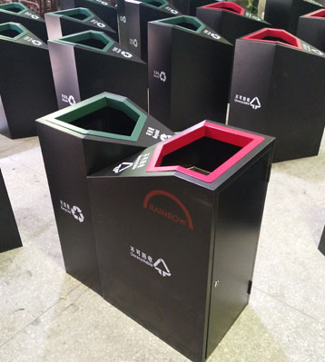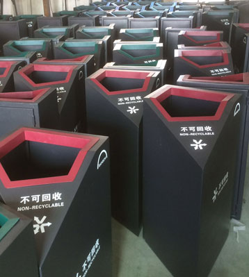 • 產品材質:鋼板噴塑分類垃圾桶采用優質冷軋鋼經除油-除銹-表調-磷化處理后,表面采用汽車靜電粉末噴漆工藝,噴塑粉主要有丙烯酸粉末、聚酯粉末等。雙層防銹,漆面色澤耐久;