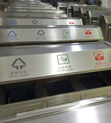優質不銹鋼材質焊接一體成型,4分類桶門板分色烤漆,與斜切面板絲印新版垃圾分類標,立體多方位提示做好垃圾精準投放,精細打磨無利口。