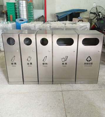 • 產品材質:戶外五分類垃圾箱根據客戶需求可采用201#,202#,304#優質不銹鋼材質模壓或焊接成型,面板可分色烤漆美觀耐用,不易破損;耐火安全,適合各種惡劣氣候條件;金屬亮澤,高雅美觀,廣泛適用于各種戶外場所;內外表面光潔,減少垃圾殘留,易于清潔;配置鍍鋅板內桶,便于垃圾清倒。