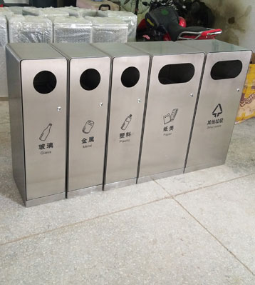 由3個小的玻璃、金屬、塑料與2個大的紙類、其他垃圾箱組合而成,帶三角鎖正面開箱門保障內桶耐用性,不銹鋼工藝焊接成型戶外高檔防銹!