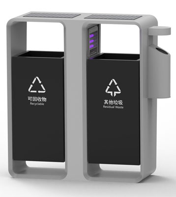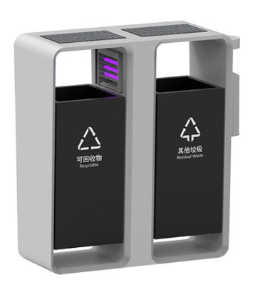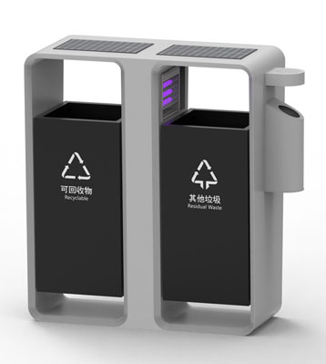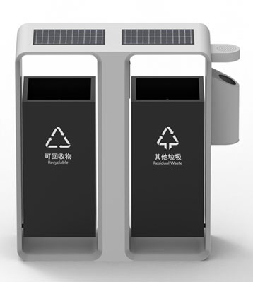智慧城市戶外滅蚊燈垃圾桶側面煙灰柱滅煙及煙蒂收集使用定制設計,絲印新版可回收物、其他垃圾分類標識,前后搖擺分類桶桶身取出內桶清運垃圾。底座預留孔位與地面固定,安全防傾倒。