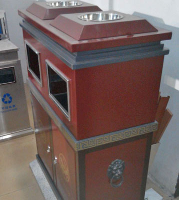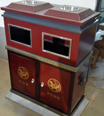 鋼板戶外環保分類垃圾桶表面經過除油、噴砂防銹處理后,再進行酸洗磷化處理,用的是戶外塑粉,比烤漆附著力強,色澤靚麗防銹能力強。